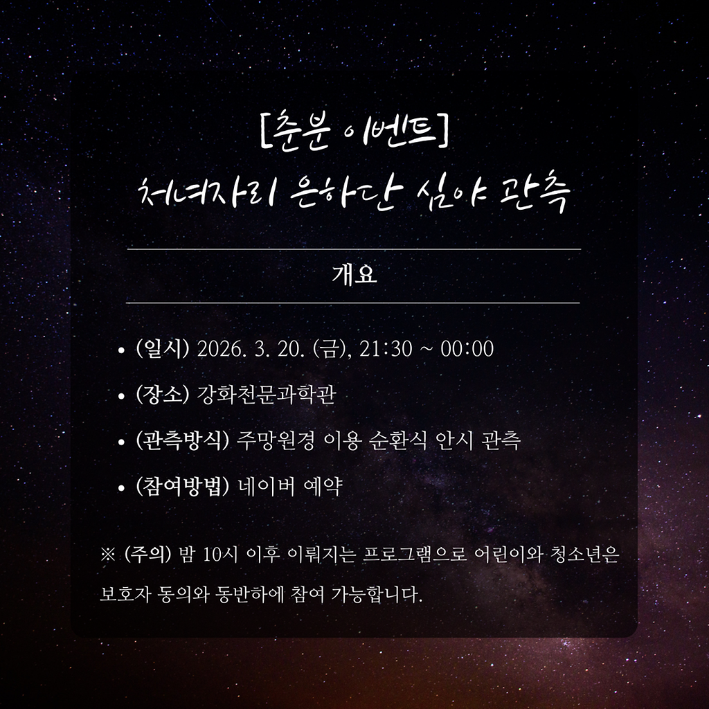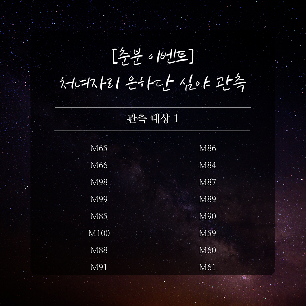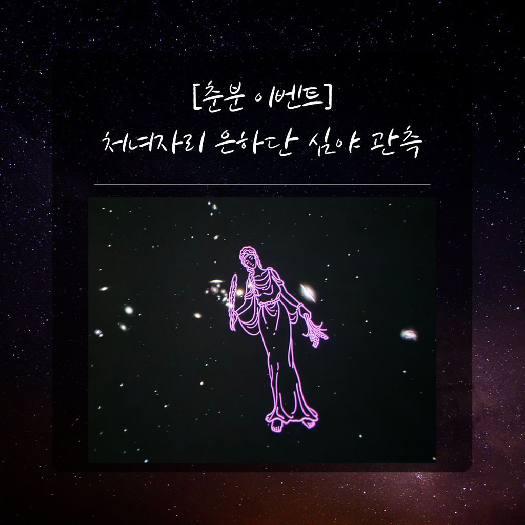 [춘분 기념 이벤트 관측]'처녀자리 은하단 심야 관측'ㅇ (일시) 3. 20. (금), 21:30 ~ 00:00ㅇ (장소) 강화천문과학관ㅇ (예약) 네이버 예약월령과 날씨를 고려할 때 3월 20일 오직 하루만 가능한 관측 이벤트입니다.