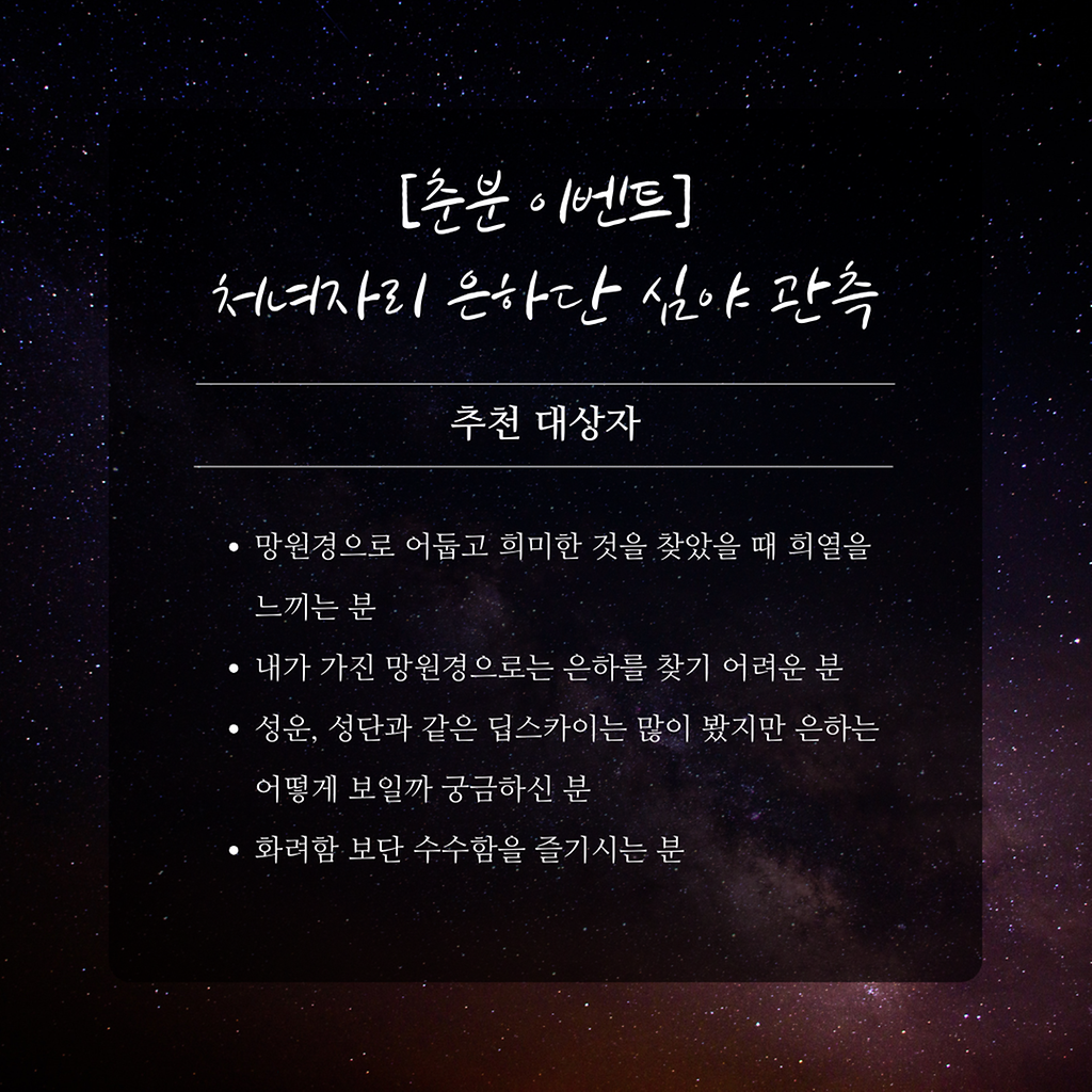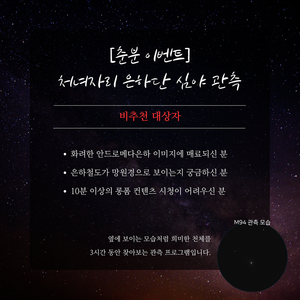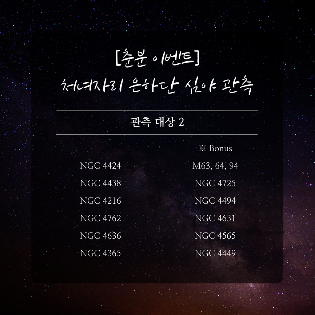 [춘분 기념 이벤트 관측]'처녀자리 은하단 심야 관측'ㅇ (일시) 3. 20. (금), 21:30 ~ 00:00ㅇ (장소) 강화천문과학관ㅇ (예약) 네이버 예약월령과 날씨를 고려할 때 3월 20일 오직 하루만 가능한 관측 이벤트입니다.